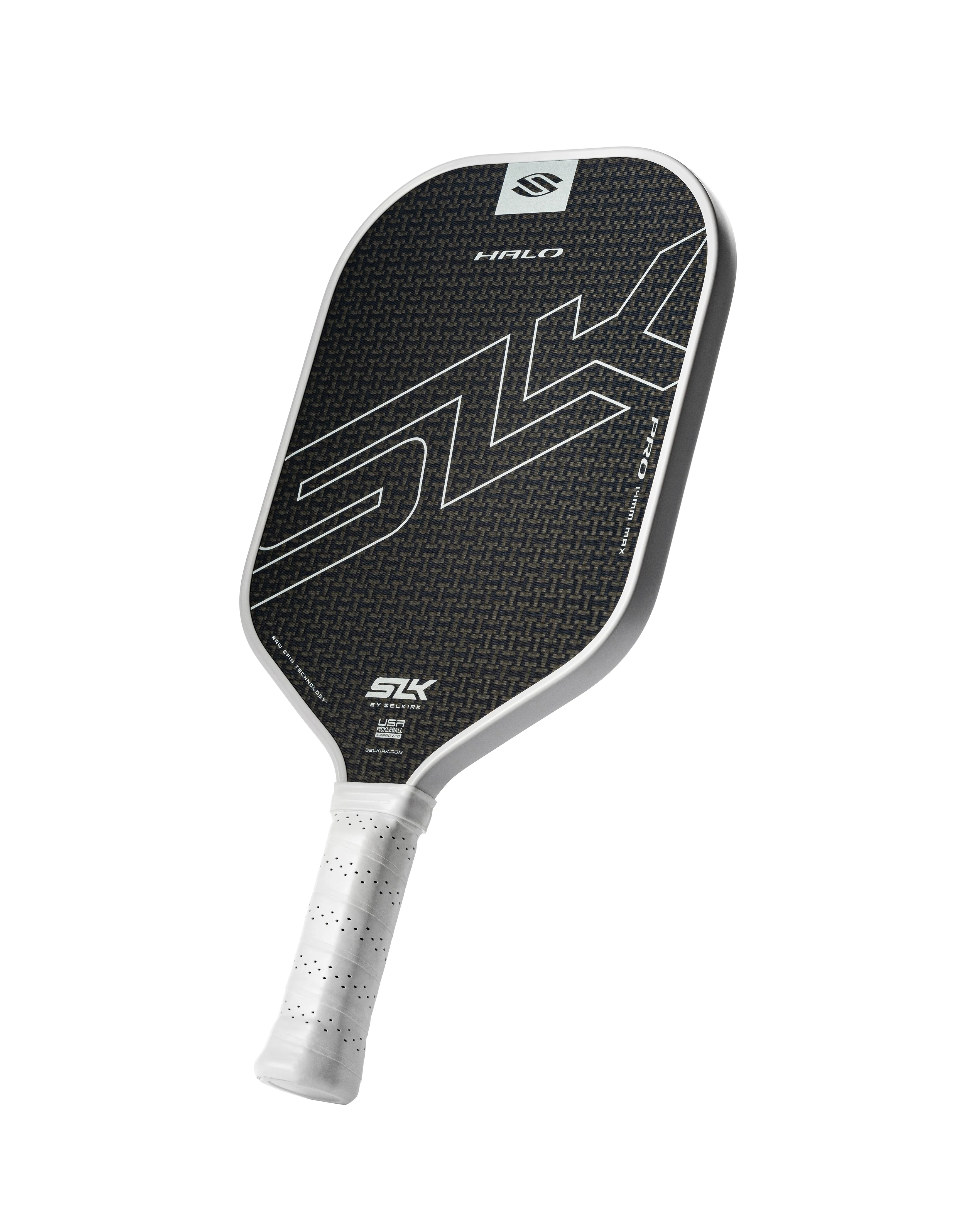 The SLK HALO Pro's resilient raw carbon kevlar surface improves spin, and its large sweet spot and lighter weight enhance maneuverability, allowing for powerful drives, speed ups, and put-aways with control at the net, solidifying it as the pinnacle of craftsmanship and performance within the HALO series of paddles.